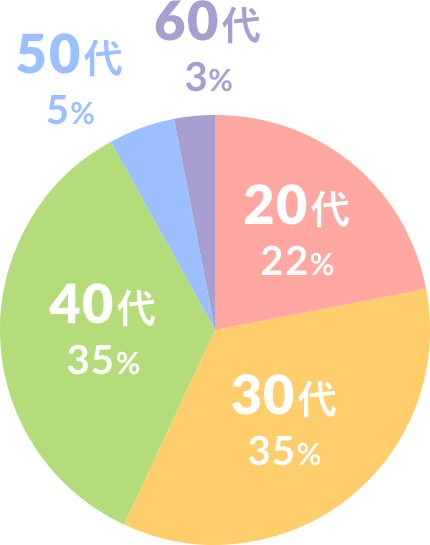 年代別の割合は、20代は22%、30代は35%、40代は35%、50代は5%、60代は3%と、20代〜40代を中心に幅広い年代の方々にお越しいただいています。