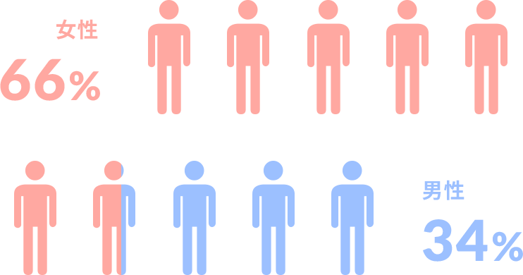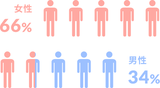 GOODSUNPLUSでトレーニングを行っているお客様は、女性が66%、男性が約34%と、女性が半数以上を占めています。また、女性は、ダイエットや健康維持を目的として、男性は、ボディメイクを目的としてトレーニングを行う方が多数です。