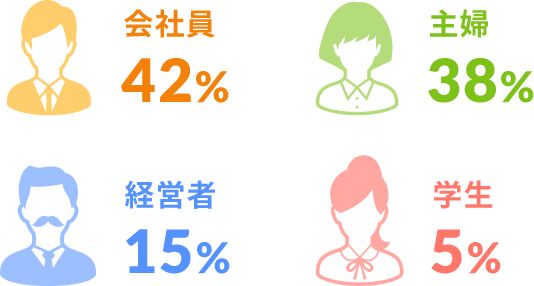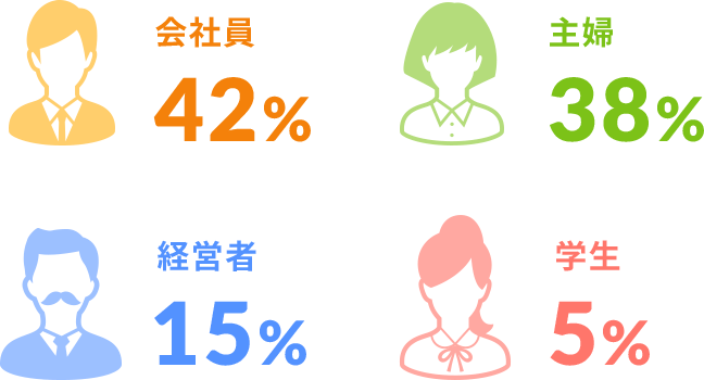 GOODSUNPLUSでトレーニングを行っているお客様は、会社員・主婦のお客様が最も多く、全体の割合は、会社員が42%、主婦が38%、経営者が15%、学生が5%です。多くのお客様が会社帰りや日中の空き時間などを活用してトレーニングを行っています。